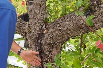 15年前の雪害で折れ、ダメになってしまったりんごの樹を、ボルトや金属パーツを使い”手術”をし、修復をしたそうです。