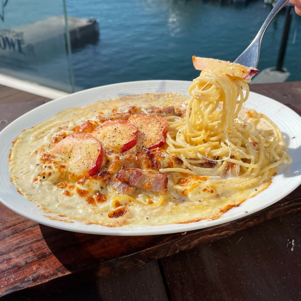 カットした紅の夢をクリームチーズソースのスパゲティに加えて、ベーコンとたっぷりのチーズをかけてグラタンのように焼き上げます。