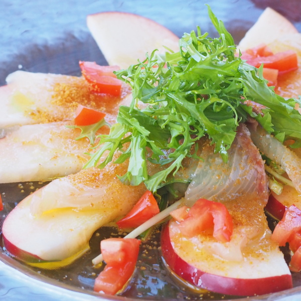 紅の夢と白身の地魚を重ねて、オリーブオイルとカラスミを。紅の夢を食べると果汁が口に広がり、酸味もありドレッシングのような感覚かもしれません。