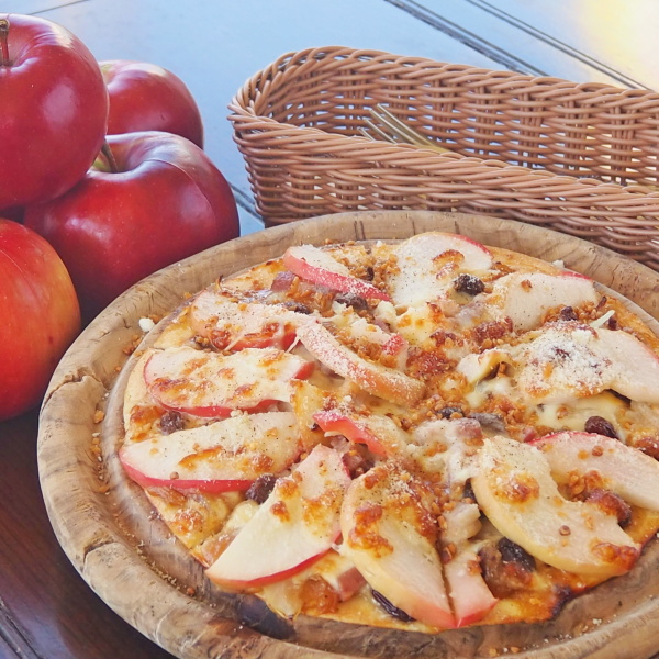 紅の夢の優しい色合いが美しいりんごが主役のピザ!生地にはお砂糖不使用の紅はるかペーストを塗り、たっぷりのチーズとベーコンを。芳醇なラムレーズンと香ばしいアーモンドを散らして主役の紅の夢をのせて焼き上げます。甘酸っぱいりんごとチーズの塩味がこんなに合うなんて驚きました。