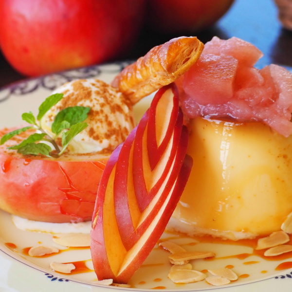 プリンの周りには秋田県横手市の3種類のりんご、紅の夢、王林、ふじのスライスと紅色が美しい紅の夢のコンポート。