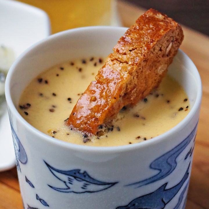 アクセントに加えたブラックペッパーが全体をまとめて引き締めます。ゴンゴンゾーラチーズが主役ではありますが、プリンとしての美味しさも出せるよう追求しました。