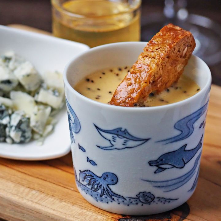 ちょこんと顔を出しているビスコッティはチーズとよく合います。ビスコッティのアーモンドと小麦の風味を味わいながらゴルゴンゾーラチーズも味わう。そうです、ワインとも合います!