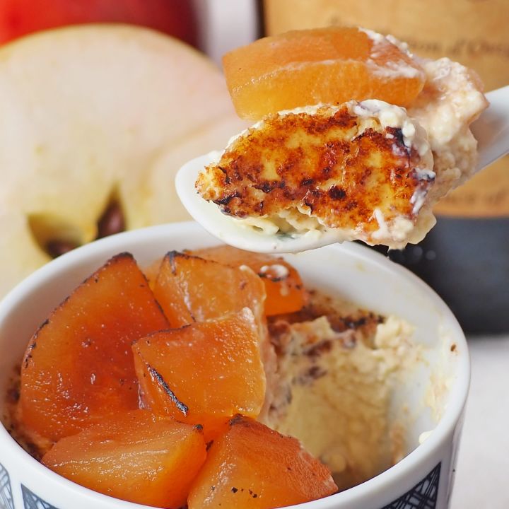 ブリュレプリン生地と一緒にすくって食べると芳醇なカルバドスが香る濃厚クリーミーな食感と紅の夢の甘酸っぱさ、ふんわりシナモンの香り♪