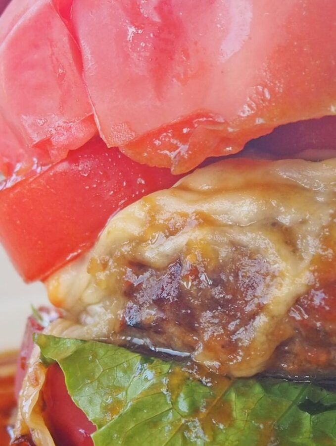 間には三元豚ひき肉の分厚いハンバーグとチーズ、トマト、レタス。