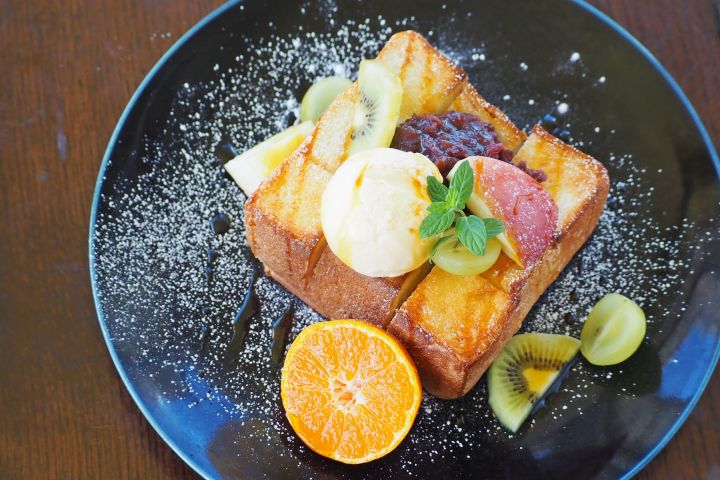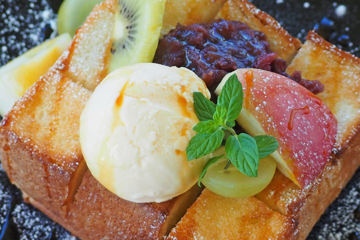 分厚すぎるバタートーストはそれだけでテンションが上がります✨フルーツと大納言あんこ、温かいトーストにバニラアイスがとろけます🤤