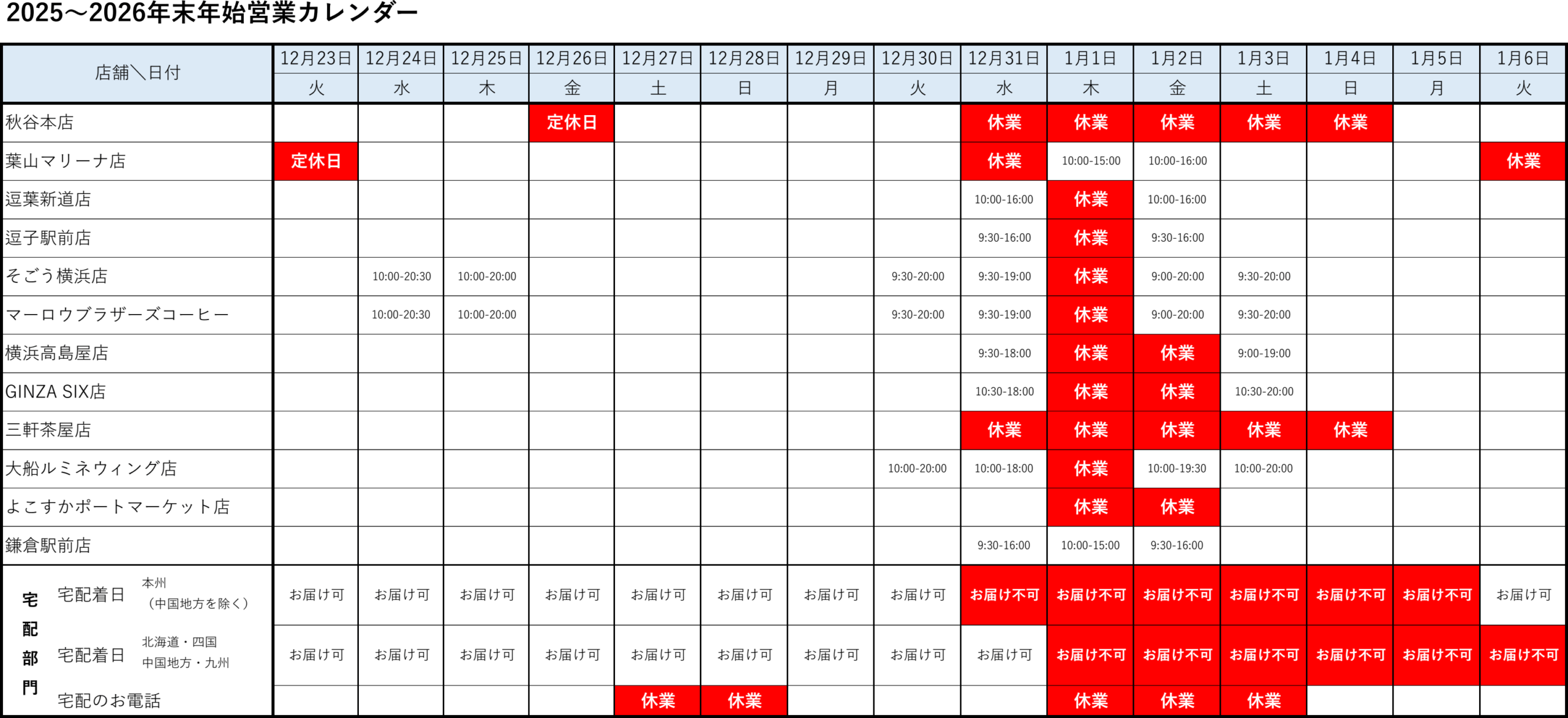 年末年始の各店の営業時間および、休業日は下記のとおりとさせていただきます