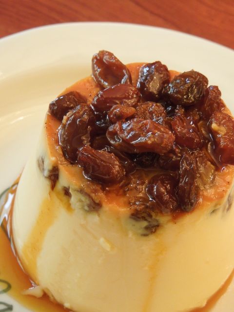 カラメル部分にラムレーズンをたっぷり入れ、その上からカスタードプリン生地を流して焼き上げました。