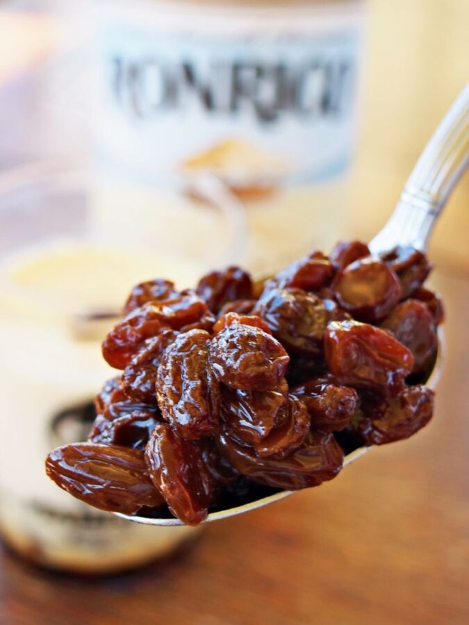 ラムレーズンプリンのために仕込む、特製ラム酒漬けレーズン。長期間じっくり漬け込んだレーズンは香りもコクも別格です。