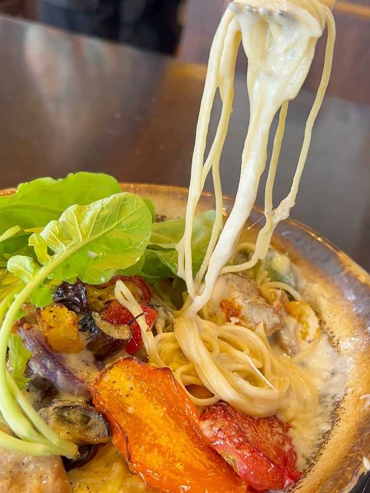 たっぷりのにんにくと牛乳で作るバーニャカウダソースに旬の野菜とチキンがゴロっと入った具だくさんスパゲッティです。