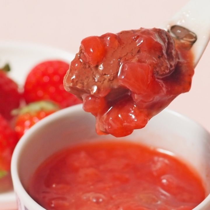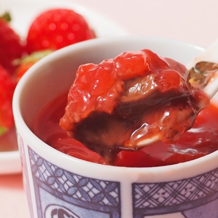 生チョコレートはいちごソースに合うように柔らかめに作りました。いちごソースと一緒にすくって食べていただくといちごの甘酸っぱさとチョコレートの甘さがとても美味しいです。